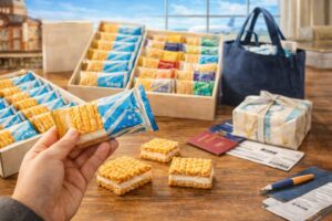 空港は温度差や移動時間の影響を受けやすいので、チョコ系の扱いは少し丁寧に。冬は持ちやすいですが、暖房の効いた場所に長く置くのは避けたいところです。あと地味に大事なのが、スーツケースに雑に入れて割るパターン。箱ものは上に重い荷物を乗せない。これだけで事故率がかなり下がります。