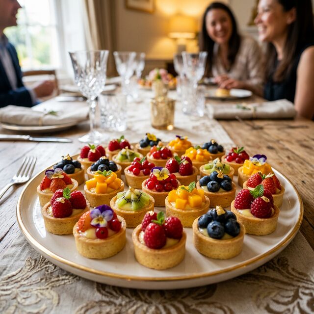 パーティーの締めくくりにふさわしい華やかさを持ちながら、ナイフもお皿もフォークも一切不要。指先でつまんでパクッと食べられるという、徹底的なホストへの配慮が施されています。香ばしく焼き上げられたタルト生地のサクサク感と、凝縮されたドライフルーツやナッツの芳醇な香り、そして上品な甘みのダマンド生地が、口の中で完璧なハーモニーを奏でます。